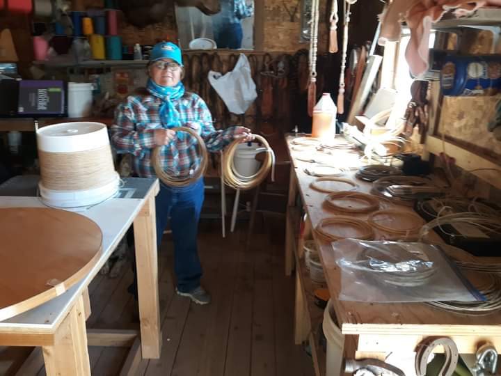 The last stop on the home tour was the outbuilding they’ve turned into their workshop and studio. Here Cindy painstakingly braids her reins, hackamores, and ropes from cow hide and Rod stamps, carves and embosses leather saddles, fenders, belts, chaps, and quirts, often incorporating Cindy’s braiding into the handle. “I’ve been braiding since I was 30,” says Cindy. “Word’s got out. Now everybody wants a set of handmade rawhide reins. I go from cowhide to finished product. Soak, prime, tenderize, scrape, cut, and pull strings. Some reins take three weeks.”