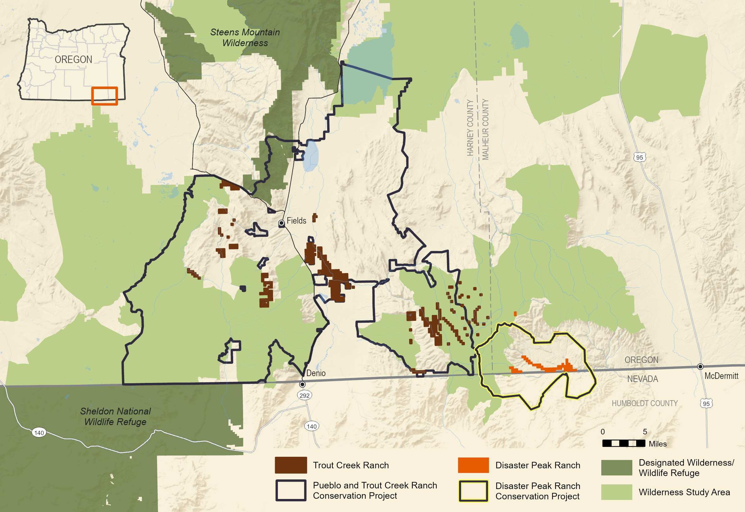The property and associated grazing permits range in elevation from 4,900’ along McDermitt Creek to over 8,000’ near the summit of the Trout Creek Mountains. These lands provide climate-resilient habitat connectivity on more than one million acres of land, linking Steens Mountain Wilderness to the Owyhee Canyonlands. The lands connect with Trout Creek Ranch, which sits immediately west of Disaster Peak Ranch, and their respective grazing allotments connect at the summit of the Trout Creek Mountains. These adjacencies create a conservation effort that stretches 75 miles from west of the Pueblo Mountains to the Oregon Canyon Mountains, near McDermitt on the Oregon/Nevada border.