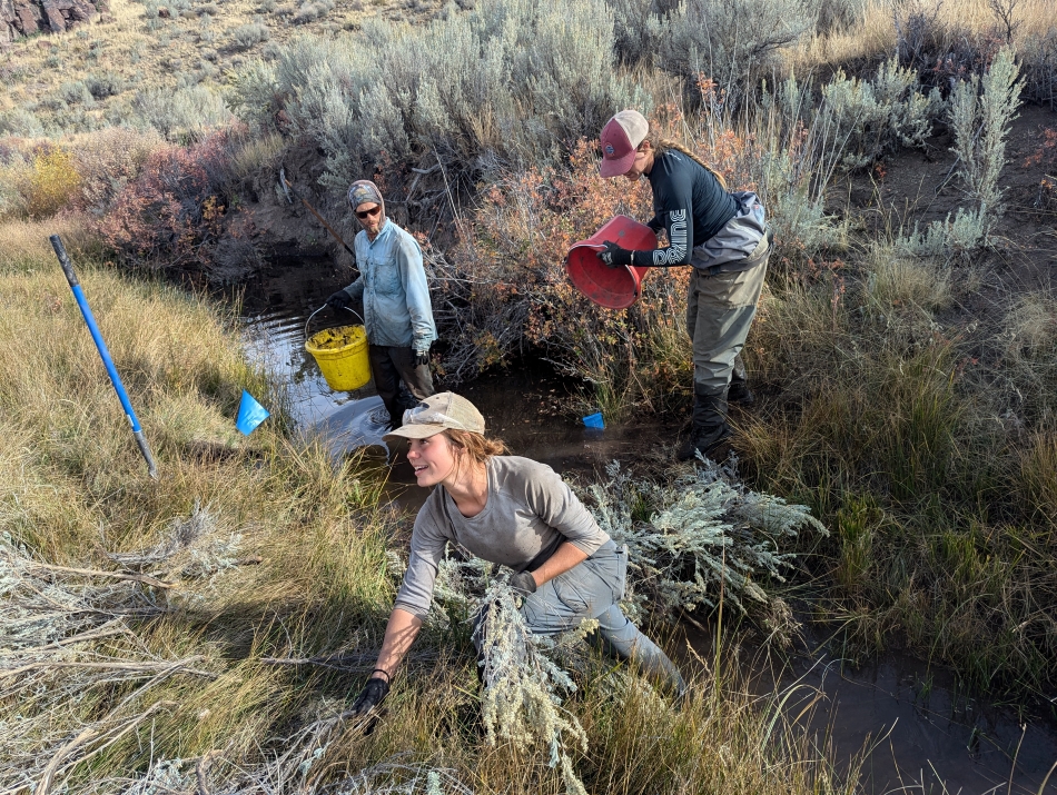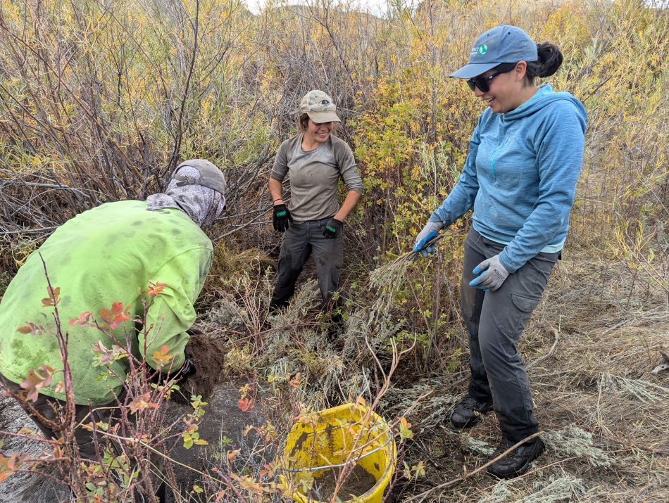Abby Carter grabs sagebrush and sod to install a beaver dam analog (BDA) with fellow Anabranch Solutions crew members Jordan Beaver and Hailey Clausen in fall of 2024. — Jessie Griffen
