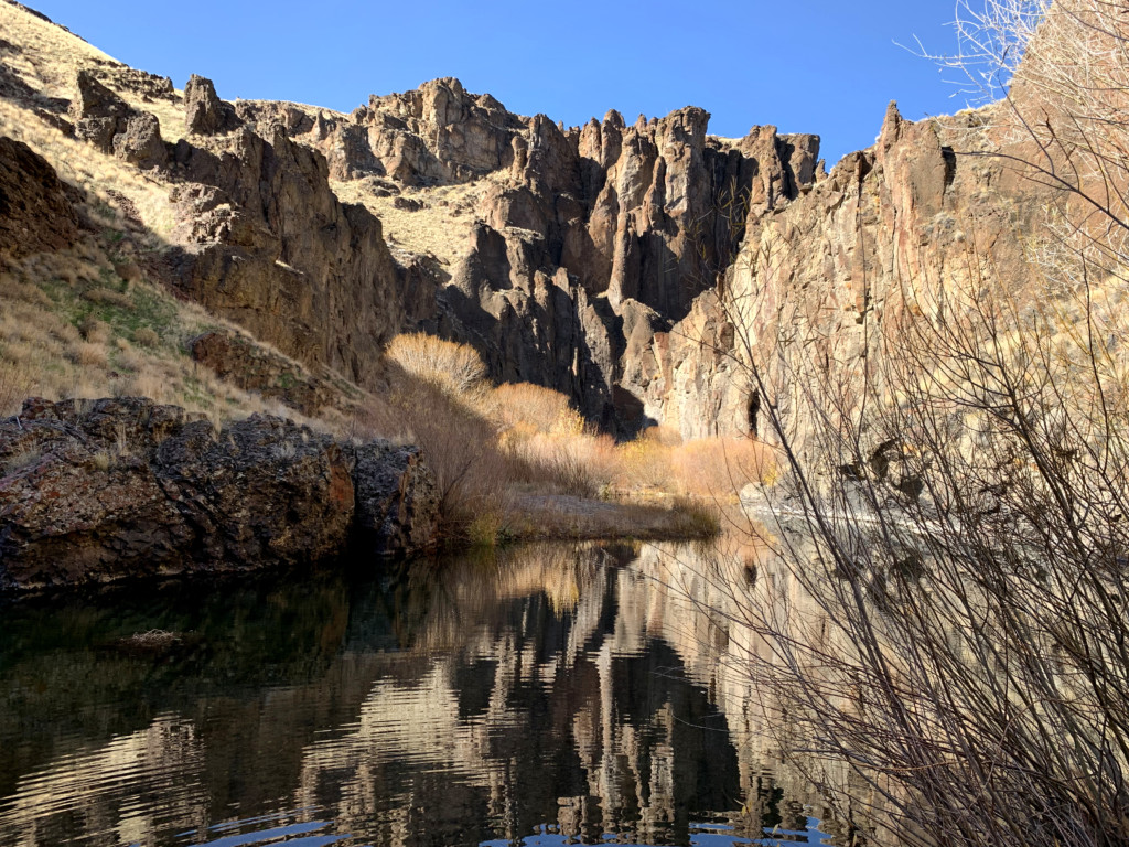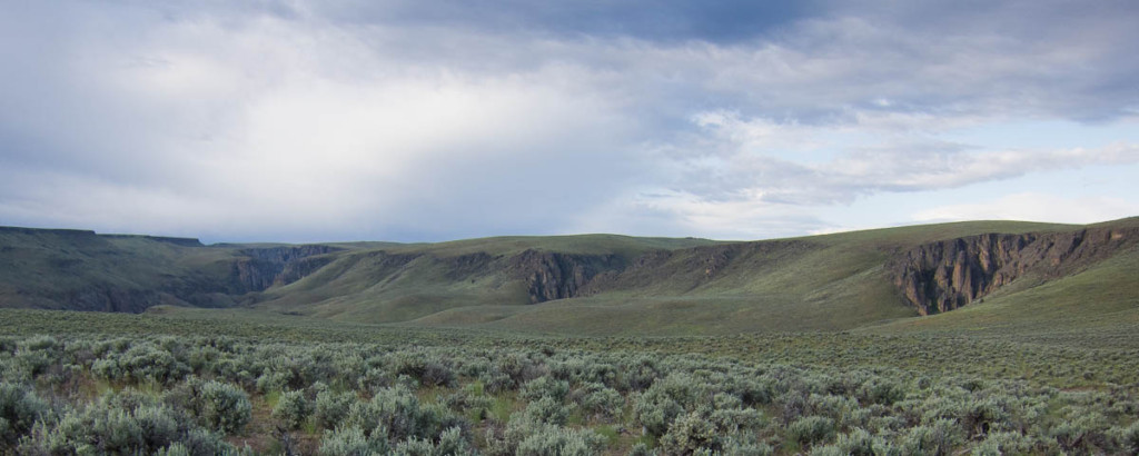 The West Little Owyhee Wild and Scenic River starts at 6,508 feet near the Nevada-Oregon border, east of McDermitt, Nevada. It flows east by Deer Flat and into Louse Canyon. Near a prominent feature known as Twin Buttes, it turns sharply north as it cuts through a small canyon, making its way to the Owyhee River.