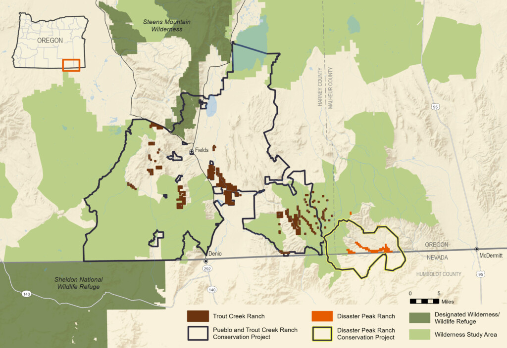Over 90% of Disaster Peak Ranch is within The Nature Conservancy’s national map of Resilient and Connected Landscapes. With proposals for mining in the larger McDermitt Caldera region, it is more important than ever that we keep the most sensitive and valuable lands intact for people and wildlife. From high elevations to streambeds, Disaster Peak Ranch and Trout Creek Ranch provide climate-resilient habitat connectivity on more than one million acres of land, linking Steens Mountain Wilderness to the Owyhee Canyonlands. Disaster Peak Ranch itself includes a state-designated Conservation Opportunity Area, and an Important Bird Area. It also includes a private inholding within the 51,290-acre Fifteenmile Creek Wilderness Study Area that is currently proposed for permanent wilderness protection by Oregon’s congressional delegation.