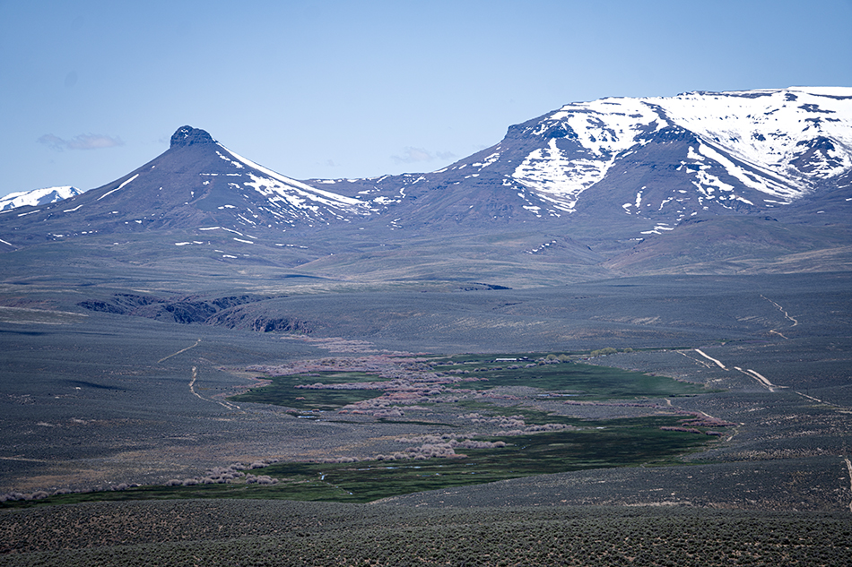 The McDermitt Caldera, a collapsed lava dome, marks the southern edge of the Trout Creek Mountains. In days past it was touted as producing the richest supply of mercury in the western hemisphere. Now lithium is the hot topic. A large deposit is located on Disaster Peak Ranch, which sits within the large caldera. Hyland warns that mining the lithium would ruin the Disaster Peak Ranch environment and operation. “They will take all of the Disaster Peak [BLM] permit. If Western Rivers hadn’t bought the ranch, the mining companies would have.” According to Hyland, three different prospect companies are currently drilling “all the way through the caldera.” He reflects for a minute, then adds, “The environmental perspective looks more interesting to me. It’s ironic that for green energy they will destroy one of the most beautiful places on this green, God-given earth.”